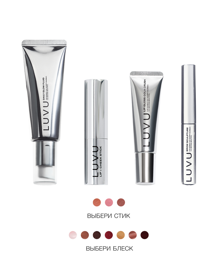 Готовый набор из четырех продуктов для создания естественного макияжа на каждый день. Сияющая кожа, идеально уложенные брови, увлажненные губы и немного румянца на щеки — продукты, которые идеально работают вместе и помогают сделать макияж за 5 минут в любых состояниях и обстоятельствах.